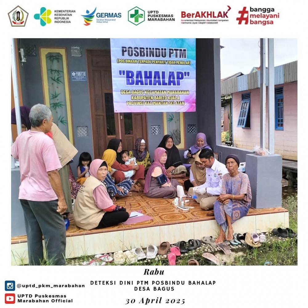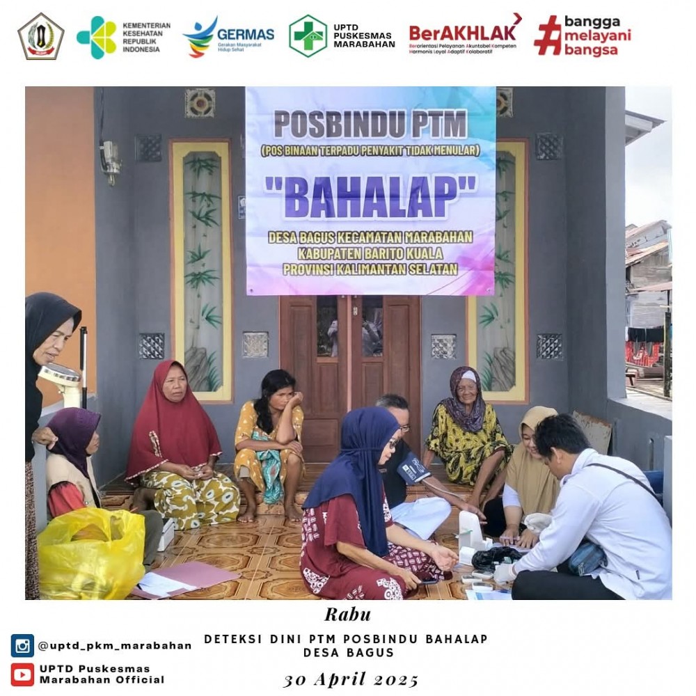 30 April 2025 DesBag Mehabarkan, Pos Pembinaan Terpadu Penyakit Tidak Menular (POSBINDU) Desa Bagus digelar rutin Setiap bulan untuk memerikasa dan memantau kesehatan warga untuk penyakit tidak Menular seperti Cek tekanan Darah, pengukuran lingkar perut, pengukuran tinggi badan , cek gula darah, cek kolestrol, cek asam urat, dan undek masa tubuh yang dilaksanakan oleh Kader Posbindu PTM desa Bagus untuk bulan april di laksanakan pada warga Rt 005 dengaan antusias warga berhadir untuk memerikasa kesehatan kader dibantu oleh petugas kesehatan Desa dari Puskesmas Marabahan untuk memberikan penangan dini untuk warga yang mengalami pada saat di cek melebihi batas normal pengukuran ataupaun saat di cek dengan pemberiaan obat-obatan yang tersedia dan dibawa langsung oleh petugas kesehatan Desa. dan selanjutnya bulan berikutnya akan dilaksanakan pada warga Rt 006 (EM)
