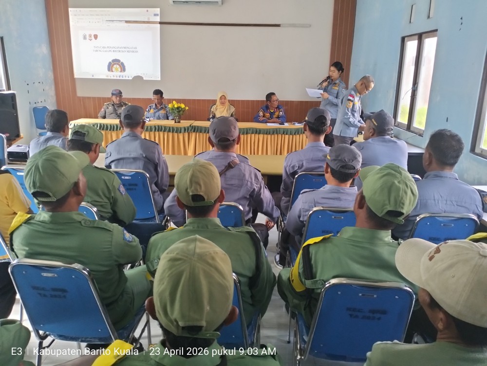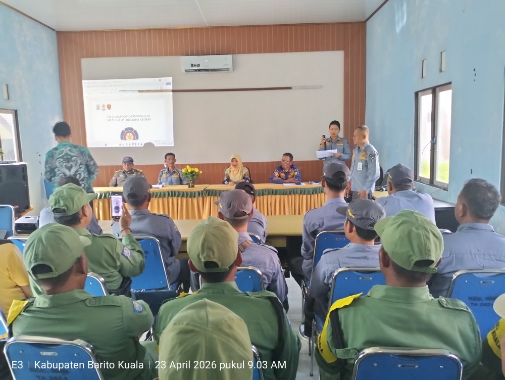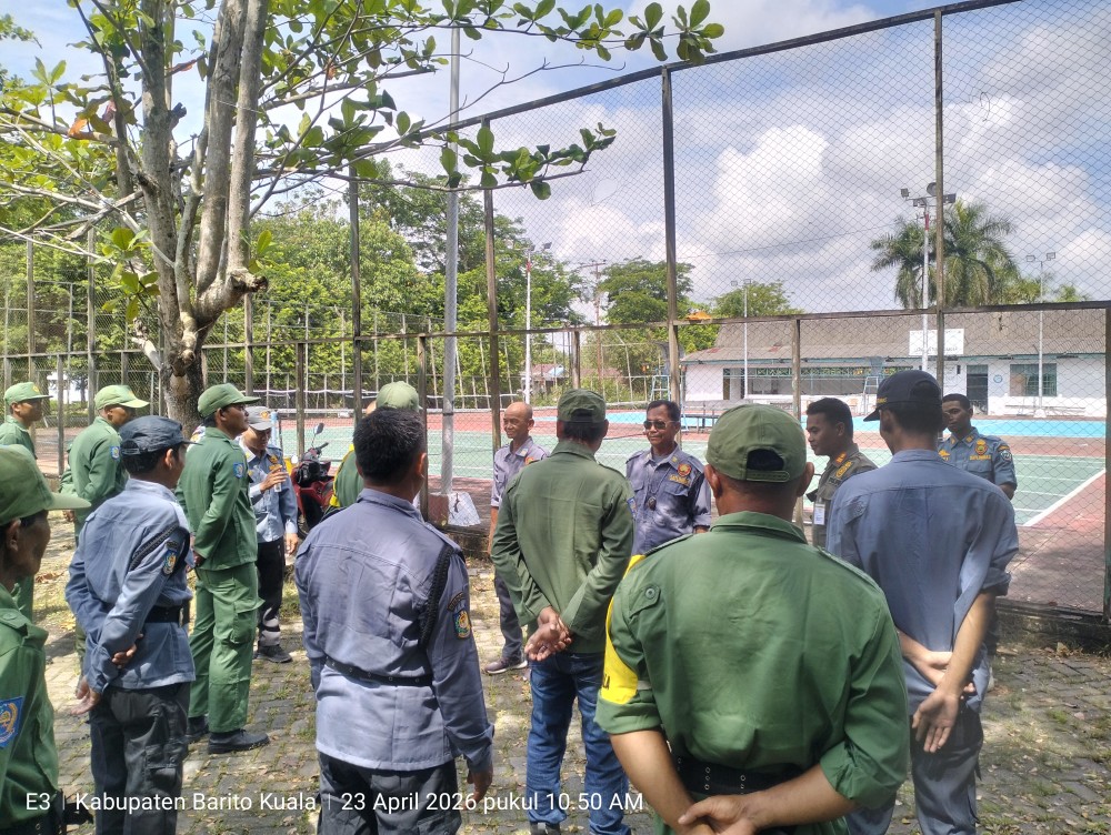 KIM Bagus Transfaran Mehabarkan, Kamis 23 April 2026 bertempat di kantor Camat Marabahan Melalui Satuan Polisi Pamong Praja Kabupaten Barito Kuala Mengadakan kegiatan Topuksi LINMAS, latihan Peraturan Baris Berbaris dan Penangulangan Bencana dengan menghadirkan 50 orang anggota linmas se kecamatan Marabahan sekaligus khusunya kesiapsiagaan untuk mensukseskan Pemilihan kepala Desa Serentak di kabupaten Barito kuala tahun 2026 rangfkaian acara di buka oleh camat Marabahan dan sambutan kepala Satuan Polisi Pamong Praja Kabupaten Barito Kuala yang di wakili oleh Kabid Linmas kemudian pembekalan materi oleh kepala Barisan Pemadam Kebaran Kabupaten Barito Kuala degan materi tentang penanganan atau cara mengatasi serta antisipasi terhadap kebocoran pada tabung gas di masyarakat.kemudia kegiatan di alnjutkan dengan latihan dasar PBB yang di pandu langsung oleh tim Satpol PP . kegiatan sangat bermamfaat bagi linmas di desa masing masing guna menjaga keamanan kenyaman ketertiban di masyarakat. (EM)
